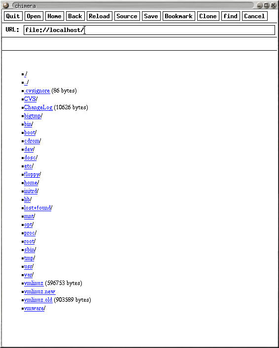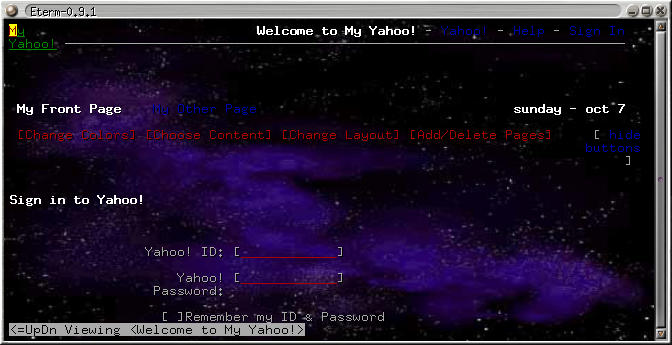 The back button doesn't allow you to pick a particular old site. Just one boring page after another. Bookmark handling poor. Doesn't write them in HTML, nor is there a nice bookmark toolbar. Crashed when going to window view, but at least had the decency to restart itself, although it didn't remember my Yahoo! cookies. The keyboard shortcuts that exist are weird. What's this Alt-X to exit? How about C-q?