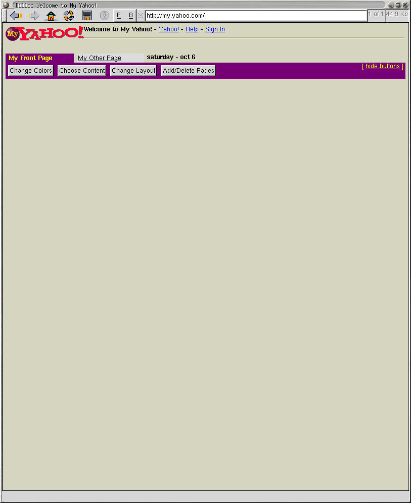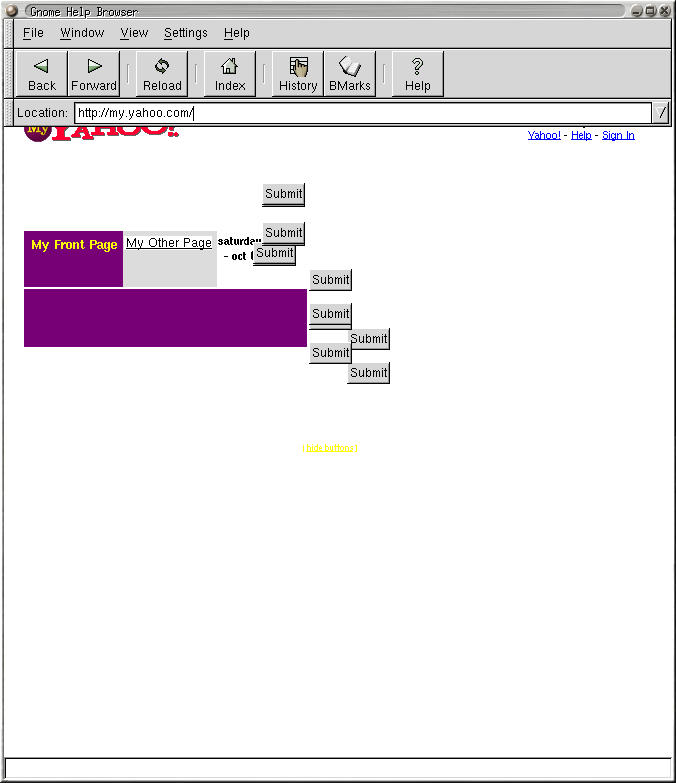 Doesn't handle alignment. Only shows a couple of widgets on the Yahoo! site, which stayed on the screen the entire session. Doesn't hack frames. Was totally slow downloading the AMEX site, and then did the same thing it did with Yahoo! Doesn't handle https whatsoever. Unlike Netscape, it *could* show all the photos at the Underwater Cleanup site, but then wouldn't render a blow-up. It renders the Myplay site as a blank page and overlays my photos on top of one another. We'll leave it for rendering the Gnome help,which it does well.