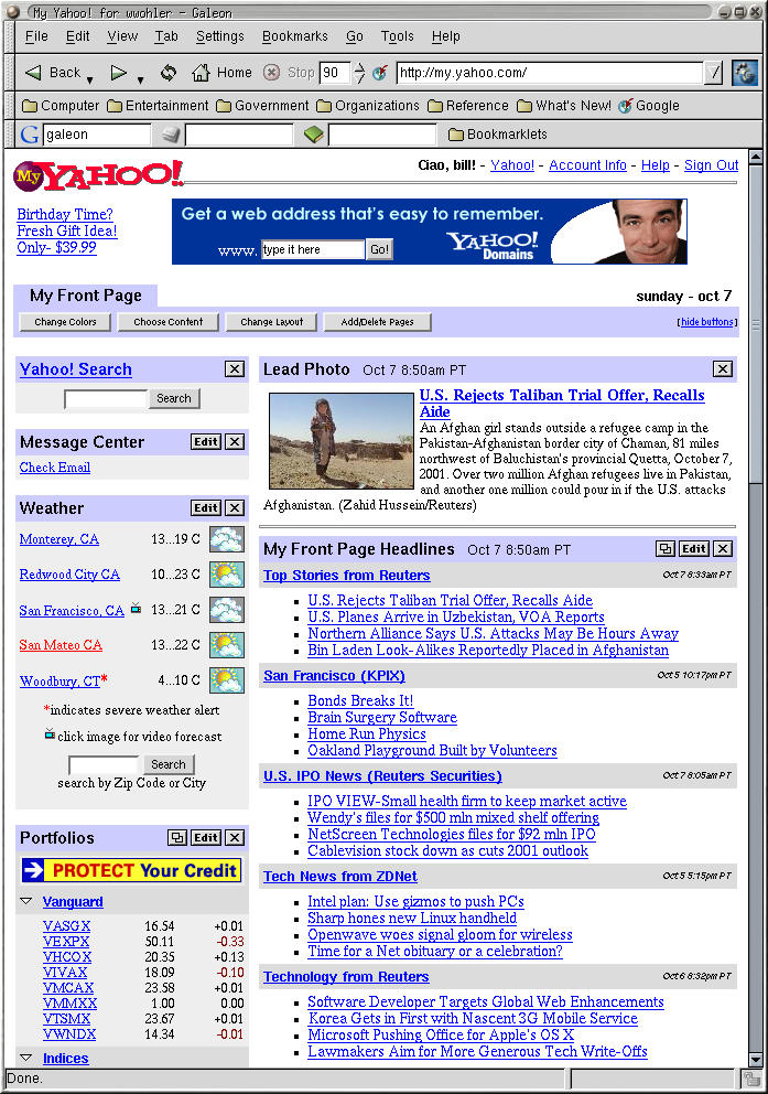 2006-07-20: A few days ago I started using Google's customized home page. This page crashed Galeon and there didn't appear to be any recovery. So, I gave Firefox 1.5.0.4 a whirl. Firefox lacks the "animate images once" and the "smart bookmarks" feature, but its search engine feature is close enough. Its ability to block popups and its rich library of extensions far outweighs the minor shortcomings. Plus people know what I'm talking about when I mention the name of my browser. So, it looks like I'm going to stick with Firefox now.