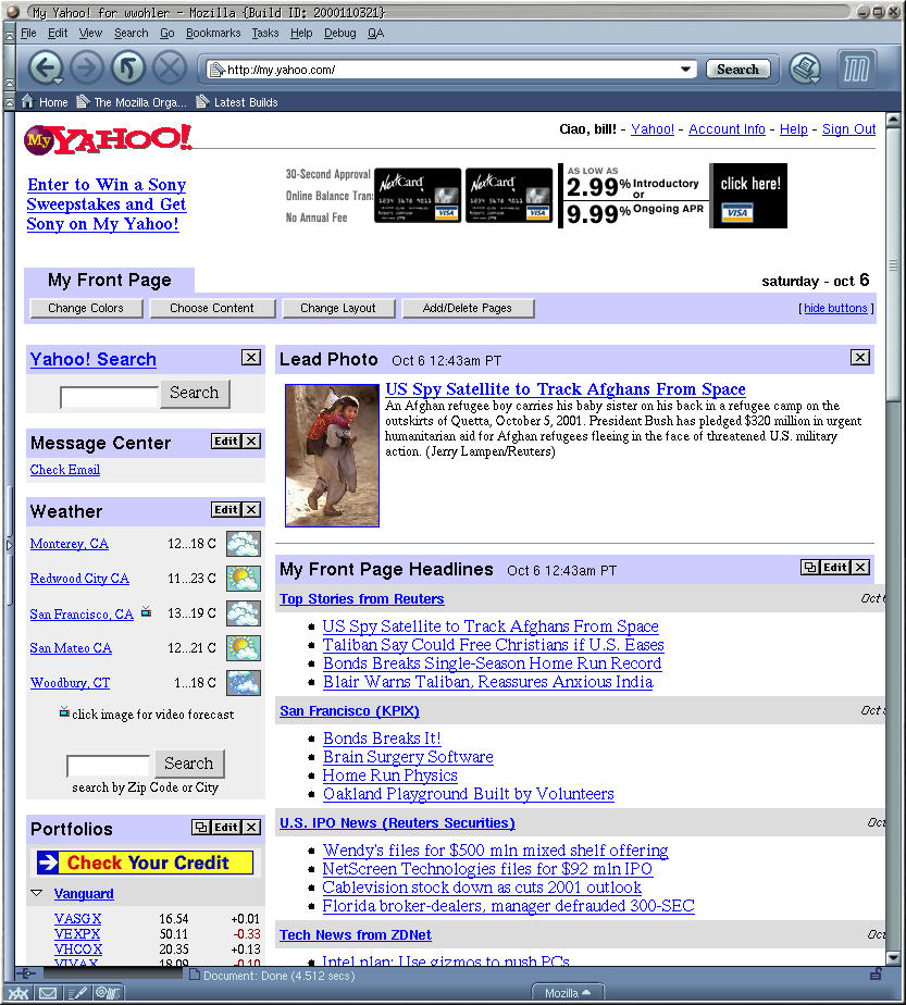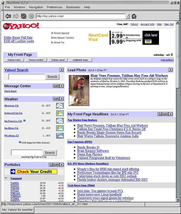 2001-10-08: Found the Debian smart bookmarks. Simply type in your favorite Debian package in the toolbar and get the package info or bug reports. C-TAB tabs between frames.