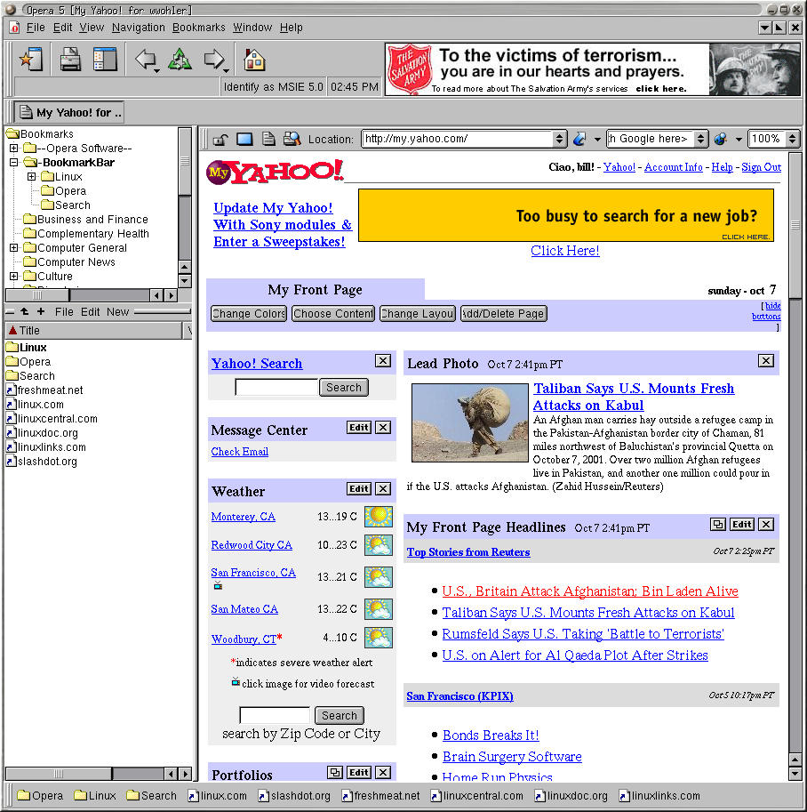 Opera has two Linux browsers, one with a dedicated ad space, and another that you can purchase for $39. For evaluation purposes, I downloaded their dynamically linked .deb because for some reason, I already had libqt2 installed. They also have a statically linked version as well. It installed without any fanfare like any well behaved Debian package.